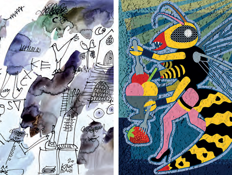 Georg Karbach: "Ohne Titel", 2020 (Ausschnitt). Thomas Manelli Mann: "Die gemeine Sommer-Furie", 2022 (Ausschnitt)