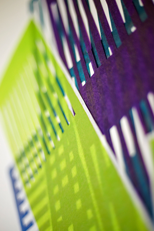 Neben Zeichnungen und klassischem Holzschnitt zeigt die Künstlerin Katharina Fischborn aus der Reihe der Hochdrucke Quartette und Druckstücke. Mit meist vertikalen, aber auch horizontalen Schichtungen, hier aus zunächst monochromen Drucken vom Pappelholz, entstehen architektonische Gebilde. Die einzelnen, transparenten und wenige opake Unikat-Flächendrucke sind der Wirkstoff, in den durch Skalpellzeichnungen fensterähnliche Öffnungen geschnitten werden. Dann werden diese Drucke oder Bauteile hintereinander gestaffelt, sodass sich neue Mischfarben ergeben.