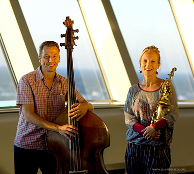 Alexandra Lehmler - soeben frisch mit dem Landesjazzpreis Baden-Württemberg ausgezeichnet - und der in Speyer aufgewachsene Bassist Matthias Debus haben beruflich und privat schon jede Menge Lebenszeit miteinander verbracht. So versorgen sie nicht nur die zwei gemeinsamen Kinder, sondern kümmern sich neben anderen Projekten auch um die gemeinsamen musikalischen "Babies". Während aber in ihren gemeinsamen Bands "Netnar Tsinim", "Alexandra Lehmler Quintett" und "Herr Hering, die liebe Frau Gerburg & die Jazzband" die Rollenverteilung recht klar ist, soll in der Duo-Besetzung Saxophon-Bass der Fokus vor allem auf freierer Improvisation und dem maximalen solistischen Freiraum für jeden Einzelnen gelegt werden. Beide sind Gründungsmitglieder des "Hermann Art Kollektivs", eines Zusammenschlusses regionaler Jazz-Musiker und Kunstschaffender anderer Genres, das sich die Überwindung von Genregrenzen in der Kunst zum Ziel gesetzt hat.
