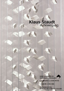 Klaus Staudt nimmt im Bereich der geometrischen Abstraktion eine höchst eigenständige und unverwechselbare Position ein. Das in mehr als vier Jahrzehnten entstandene Oeuvre beeindruckt durch seine Kontinuität, Stringenz und Innovationskraft. Klaus Staudt fühlte sich von Anfang an dem Konstruktivismus verpflichtet. Seine Kompositionsweise unterliegt einem geometrisch-systematischen Denken, das die klare, einfache Bildform der konstruktivistischen Abstraktion durch das Moment der Bewegung sowie der visuellen Mehrdeutigkeit aber erweitert.