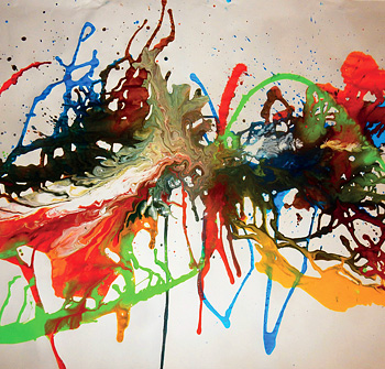 Das sind bildhaft gewordene Kinderträume - festgehaltene Stimmungen, Gefühle, Denken, Erinnerung, kindliche Lust am schöpferischen Arbeiten. Becher voller Farbe, dünne und dicke Pinsel, Papier, Holz, Stoff, Draht, Karton, Schwämme, Kork, Federn, Keramik, Stroh, Muscheln - alles darf vollkommen frei verwendet werden - und erhält durch Pablo-Kinderhände neue Bestimmung, Ausdruck und Form.