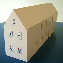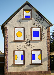 "Das Gebäude wird durch fünf musivische Bilder in Bleiverglasung optisch aufgewertet. Die fünf Glas-Bilder gefertigt aus den klassischen "Glasscherben" der Kunstglaserei (orangerot, Opalglas weiß und dunkelblau) werden durch Bleiruten gefasst, damit grafisch linear kommentiert und in die bereits gestalteten Applikationen integriert. Die Glasbilder werden in moderne Doppelglasfenster eingepasst. Die Glasbilder schließen die Fassade materiell nach Außen hin ab. Definieren jedoch extrovertiert die Kunstfunktion des Gebäudes für die Bürger und Besucher Bellheims. Die Möglichkeit des Beleuchtens von Innen erlaubt dies auch bei Nacht. Durch das Verwenden des historischen Handwerksmediums, der Kunstglaserei, wird eine alte Tradition neu belebt. Es entsteht eine deutliche Verbindung zu dem britischen Universalkünstler William Morris (1834-1896) und seiner "Arts and Crafts"-Bewegung im England des 19. Jahrhunderts".