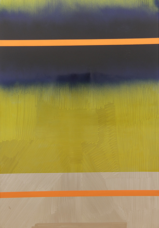 Zu Gast ist der Stuttgarter Künstler Camill Leberer, mit dem sich die stellvertretende Museumsdirektorin Dr. Annette Reich unterhält. Dabei schildert er auch seine intensiven Eindrücke, die er während seiner Afrikareisen gewonnen und in seinen direkt auf Stahlblech gemalten, großformatigen Lackbildern verarbeitet hat. Ein ausdrucksstarkes Beispiel ist das Werk "Kankan" aus dem Jahre 2007, das sich in der Gemäldesammlung des mpk befindet und jetzt in der Sonderausstellung "Bestandsprobe II - Grenzerfahrung" gezeigt wird. Der Titel verweist auf eine im westafrikanischen Guinea gelegenen Stadt. Durch seine intensive Farbigkeit zieht die Arbeit den Blick auf sich. Ein leuchtendes dunkles Blau, ein helles strahlendes Gelb, ein kräftiges warmes Orange stehen nebeneinander und sprechen die Wahrnehmung an. Die Farben besitzen einerseits eine gemalte klare Kontur - sie setzen Grenzen - andererseits entstehen Farbübergänge, das heißt Grenzen werden aufgelöst. Auf diese Art und Weise betont Leberer die Tiefenräumlichkeit und dehnt den Farbraum aus.