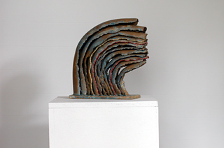 Maria Friedrich aus Neuhofen zeigt Kunstobjekte, die sowohl fragil auf einer Stange sitzen oder ganz stabil sich auf den Stelen präsentieren. Verdrehte kleine Frauenkörper mit oder ohne Flügel, kaskadenähnliche Objekte oder auch abstrahierende Gegenstandsformen in unterschiedlich schönen Glasuren werden von ihr jeweils in Gruppen gezeigt.