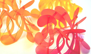 Ines Arndt zeigt Schmuck. Ein grundlegendes Thema der konzeptionellen Gestaltung ist die Anfertigung eines Armbandes, das von jeder Frau getragen werden kann. Dieser Schmuck besticht durch unterschiedliche Farben, aber auch durch gleiche Gliederformen aus Polypropylen mit einer Steckverbindung aus Edelstahl. An der Ringform kann man die Einzelform gut nachvollziehen. Die Anmutung der Schmuckstücke ist sehr sinnlich.