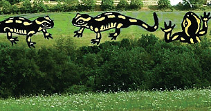 Eine spontane Idee zu der Vorgabe: "Brandmale - in die Landschaft gebrannte Bilder". Assoziationen zum Feuersalamander: - fremdartig - selten - giftig - nach mittelalterlichem Aberglauben feuerfest - lebt im Verborgenen - wirkt urtümlich - unheimlich - feucht glänzend und schön - schwarz-gelbe Warnfarbe - ist er gefährlich? - Läuterung - aus Feuer geborenes Leben - Die Evolution eines Feuerbildes: Geboren aus gelbroten Flammen werden die Salamander schwarz in die Wiese eingebrannt. Flächen werden ausgespart, die den gelben Flecken entsprechen, anfangs noch grün sind. Gelbsenf verleiht den Flecken später ihre gelbe Farbe. Phacelia färbt in der Blüte die Brandstellen blau, im Verwelken wieder schwarz. So entsteht übers Jahr ein ständig wechselndes Sinnbild für Veränderung und Entwicklung.