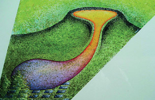 Auf der dem Betrachter zugeneigten Hangfläche ergießt sich aus einem verkohlten Krater ein leuchtend goldgelber Lavastrom der langsam zu Tal fließt. Im Bereich seiner erstarrenden Ausbreitung wechselt er die Farbe spektralförmig bis zu einem dunklen Indigoblau. Der Fuß der Eruption bedeckt Pflasterflächen in den Farben der Natursteine aus der Westpfalz. Das Bild ist auf die grüne Wiese projeziert. Der Kraterrand wird mittels Düngern dunkler gezeichnet. Der austretende Lavastrom wirkt im oberen Teil durch den Gelbsenf leuchtend gelb. In seinem Fluss nach unten geht er in die erstarrte Form über. Dies wird mit blau blühender Phacelia dargestellt. Letztendlich vermitteln quadratische Flächen den Eindruck von Pflastersteinen, die ja auch das Endprodukt dieses Vulkanausbruches sind. Dieses Material für die Pflastersteine stammt aus dem Steinbruch in Kreimbach-Kaulbach, der durch die Lavamassen in der frühen Permzeit, vor etwa 290 Millionen Jahren entstand. Das Gestein "der Kuselit" ist von Kusel abgeleitet.