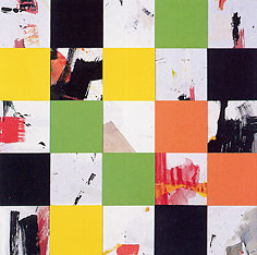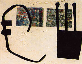 Mariana Cinteanu stellt im vorletzten Gewölbe aus. Hier vereint sich gestische Malerei, die in einem sehr dynamischen, rhythmischen und virtuosen Duktus in Schwarz, Grau oder Rot aufgetragen wird, mit konstruktiver Malerei in Form von Quadraten, die Ruhepol sein können, Farbakzente bilden und spannungsreich in den Bildraum gesetzt werden. Erinnert werden wir hier vielleicht auch an die moderne Technik Fernsehen, nämlich an die schnellen Bildsequenzen oder Tastaturbetätigungen. Vierecke werden aufgeklebt. Das Material "Moosgummi" dient als Bildträger. Es ist weich, glatt, abwaschbar, farbig. Ihre Bilder besitzen einen sehr hohen Variationsreichtum, in jeder Ausstellung können sie wie in der Art von Modulen neu kombiniert werden. Jedes einzelne Feld steht für sich, besitzt ein Eigenleben und fügt sich aber auch in die Gesamtkomposition der unterschiedlichen Bildgrößen ein.