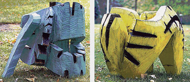 Die große Skulptur von Herrn HWP Diedenhofen ist schon von weitem zu erblicken und erobert sich den Raum. In sie kann man sich übrigens hineinstellen, sie berühren und eventuell Energien verspüren. Farbige Holzskulpturen aus Pappelholz werden mit der Kettensäge und dem Gasbrenner bearbeitet, gebürstet und farbig in den Primär- und Sekundärfarben bemalt. Sie stehen auf dem Boden, um sie zu umschreiten oder auch sich den raumgreifenden, runden Formen anzunähern oder sie hängen reliefartig an der Wand. Der Künstler benennt sie als "Brainfruits", angeregt durch menschliche Gehirne mit seinen Windungen und Verzweigungen. Es sind freie, organische Formen mit gezackten Umrissen und reliefartigen Oberflächen, gespiegelt und gedreht angeordnet, Einzelstücke, die zu einem Ganzen wahrgenommen werden. Durch seine Kunst will er Kunst als Akt des Erkennens und Wahrnehmens begreifbar machen. (Erinnert werden wir u.a. an Formen von M.C. Escher oder Zeichen der Mayakultur.) Anfangs fragte ich nach Gemeinsamkeiten. Schauen Sie sich um und tauchen Sie in die Farbebilder/-skulpturen ein.