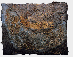 Große und kleine Formate sowie bemalte Objekte von Thomas Linder springen uns gleich im ersten Gewölbe entgegen. Die Öl- und Acrylfarben (zerriebene Erden, zermahlener Marmor) mit unterschiedlichen Bindemitteln werden dick, erhaben aufgetragen, platzen zu breiten Rissen, Spalten oder Durchbrüchen. Sie bilden Schicht für Schicht Krater, Hügel, werfen Schatten und wachsen auch über den Rahmen hinaus und kommen nur langsam zum Stillstand. Für den Künstler Linder ist es nicht einfach, ein Bild als fertig zu bezeichnen. Es kann vorkommen, dass er nach einiger Zeit oder auch nach Jahren das Bild noch mal betrachtet und an ihm weiterarbeitet. Und wieder werden die Hügel größer, vielleicht zu Bergen. Das heißt aber nicht, dass der Künstler kein Konzept besäße. Kreisendes, Fließendes oder Gespaltenes fügt sich durch unterschiedliche Perspektive und überlegte Kompositionen zu etwas Landschaftlichem. Zudem werden wir eingeladen, uns an einen Farbtisch zu setzen, es uns bequem zu machen, vielleicht sogar unsere Schuhe auszuziehen.