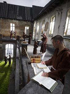 Nun denn, wenn die Welt so übel erscheint, so dekadent und hoffnungslos, bleibt nur noch eine Möglichkeit offen: ab ins Kloster! Doch Vorsicht ist geboten: nicht alles ist fromm, nur weil es eine Kutte trägt ... Dafür sorgt schon Thomas Brenner in seiner neuen Serie "Convent", mit der er seinen schon legendären inszenierten Foto-Installationen ein Prachtstück an Mehrdeutigkeit und Hinterlist hinzufügt. Einige der Brüder haben sich wohl in stiller Einfalt und in Verkennung der Heiligen Schrift in Ochs, Esel und Schaf verwandelt. Oder verweist diese Mutation auf einen mittelalterlichen Geisteszustand, der Seelenrettung immer noch mit inquisitorischen Praktiken zu erreichen gedenkt? Letztlich entscheidet stets der Glaube, wenn vertrocknete Schollen mit fragwürdigem Dünger fruchtbar gemacht werden sollen, wenn sich je zwei Mönche zwischen intrigantem Getuschel und homoerotischer Nähe begegnen oder ehrwürdige Pergamente sich auf wundersame Weise vermehren.