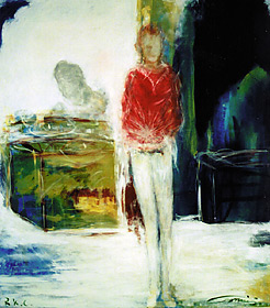 Ein großer Teil der Gemälde ist von offener Figuration geprägt. Die menschliche Figur wird dabei einzeln, zumeist als weibliche Erscheinung erfaßt und in räumliche Verortungen eingebunden. Diese Anwesenheit mädchenhafter Weiblichkeit auf dem Bildträger ist in ein vielfarbig irisierendes malerisches Kontinuum verwoben, das den Bildraum erschließt. In flüchtiger Skizze festgehalten oder in zahlreiche Lagen lasierender Farbigkeit eingebettet, tritt die jugendliche Gestalt in lichthaltigern Inkarnat als Impression eines Augenblicks unvermittelt in den Blick des Betrachters. Verschatteten Interieurs und Architekturen werden in kontemplativer Ruhe versunkene Bewohnerinnen zur Seite gestellt. Die Beschäftigung mit der Erscheinung des Menschen im Bild findet im Erfassen atmosphärischer Nuancen ihren Niederschlag.