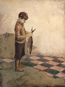 Es sind wohl teilchiffrierte Geschichten, die Ihnen Nikola Jaensch dreißigfach in kleinstem Format auf einer Wand präsentiert. Sie mögen weder Anfang noch Ende haben und doch könnten sie untereinander in einem verborgenen Zusammenhang stehen. Fragmente des eigenen Lebens oder variationsreiche Erfindungen einer Künstlerin, die auf etwas Unbestimmtes verweisen - vielleicht nur das Suchen, ein ständiges Unterwegssein dokumentieren. Doch gerade dadurch entsteht auch eine neue eigene Welt, die nur noch partiell mit der so genannten Realität in Verbindung steht. Lebensräume, in denen man sich friedlich, gefahrlos und mit voller Zuversicht bewegen darf, wenn man die einzelnen Kinder beobachtet, die in schlafwandlerischer Sicherheit auf wackeligen Stühlen balancieren… Und das harmonische Gefüge, vielleicht auch Ort möglicher Sehnsüchte, lässt sich nicht einmal durch überraschende Hintergründe aus Zeitungen und Schnittmusterbögen stören. In diesen Seelen-Räumen scheint - fern aller falscher Idylle - kein Widerspruch, keine Entfremdung Einlass zu finden…Oder?