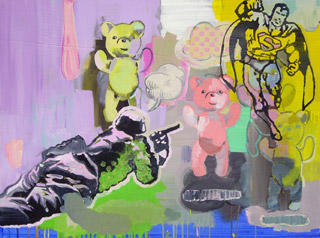 In seinen neuen Arbeiten zeigt Armin Rohr ein verwirrendes Kaleidoskop von Motiven und Figuren: Schwerter schwingende Ritter und Superman - Figuren aus Märchen- und Comicwelt - paaren sich mit Teddybären, Dinosauriern und Playmobilfiguren aus dem Kinderzimmer. Motive aus Zeitungen, eigene Fotos und Kinderportraits ergeben detailreiche Bilder, die viele Fragen offen lassen. Den Hintergrund der Gemälde bildet meist ein für Rohr typischer Farbraum aus ungebrochen leuchtender - manchmal greller Farbigkeit. Angedeutete Sprechblasen bleiben meistens leer, erklärende Hinweise damit aus. Die brachialen Posen der Spielzeugfiguren stehen in einem verstörenden Kontrast zu Kinderporträts und der Farbigkeit der Bilder. Es mischen sich jetzt verschiedene Realitäten und expressive Farbigkeit zu teilweise surrealen oder auch dadaistisch anmutenden Bildwelten. Rohr zeigt uns hier ein irritierendes Bild der Welt. Erst auf den zweiten Blick beschleicht uns Betrachter, trotz scheinbarer Fröhlichkeit, ein merkwürdiges Gefühl, eine dunkle Ahnung. Diese Welt scheint eine bedrohliche, bedrohte Welt zu sein.