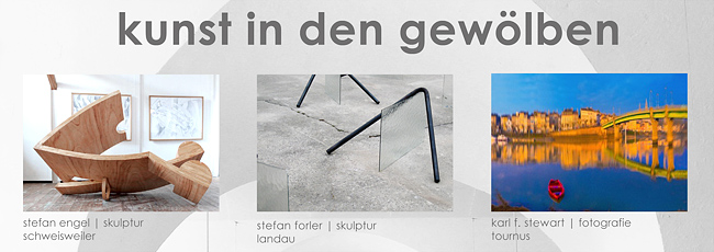 Im ersten Ausstellungsbereich, oben, beschäftigt sich eine Installation unter dem Titel "Be-Lastung" mit dem Kontrast von senkrecht stehenden Glasplatten und darauf aufliegenden Stahlbügeln. Danach, in der nächsten Gewölbenische erobert sich eine dreiteilige Arbeit den Raum und füllt ihn, trotz der geringen Stärke (d: 2 cm) des verwendeten Rundstahls. Gegenüber präsentieren sich mehrere Stahl Skulpturen (d: 4 cm) auf den Sandsteinplatten des Fußbodens und erinnern an Schachfiguren auf einem Schachbrett.
