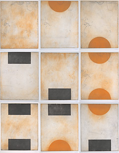 "Ein sich in Umnutzung befindliches Wohn-Haus ist zentrale Anlaufstelle des bHK geworden. Die auf die vorhandenen Fenster geblendeten Glasbilder schließen die Fassade materiell nach außen hin ab und definieren die neue Kunstfunktion des Gebäudes. Die fünf Bilder aus farbigen Glasscherben (Orangerot, weißes Opalglas und Dunkelblau) werden durch Bleiruten gefasst."