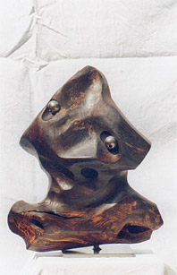Vielleicht haben Sie sich auch schon einmal die ungewöhnliche Frage gestellt: Was ist der Unterschied zwischen dem lieben Gott und den Historikern? Die mögliche Antwort: Gott kann die Vergangenheit nicht ändern. Nun, was Historiker mit oft zweifelhaftem Erfolg praktizieren, das können Künstler schon lange besser, vor allem, wenn sie nicht vorgeben, die einstige Wirklichkeit zu kennen, sondern aus ihr heraus eine andere Wirklichkeit zu erträumen. Und gerade das beherrscht Marc Reibel meisterlich! Denn allein schon sein bevorzugtes Material, die Mooreiche, die bis zu 5000 Jahre in der Erde verborgen sein mochte, wird ihm geradewegs zum Medium des träumerischen Erforschens. Oft liefert ihm die Natur diese geheimnisvollen Stücke in einer so überraschenden Weise, dass er sie nur noch neu zu entdecken braucht. Das heißt, er erfühlt regelrecht, das Potential an Formmöglichkeiten, das in dem ehrwürdigen Holz verborgen sein mag. Gerade das "Chamäleon" dokumentiert diese Ansichts-Vielfalt aufs Schönste. Je nachdem, von welcher Seite man es betrachtet, ändert es seinen Ausdruck, verwandelt sich analog zu seinem tierischen Vorbild. Nur die zwei eingesetzten Metallkugeln als Augen machen es für den Moment eindeutig zu einem gnomartigen Gesicht.