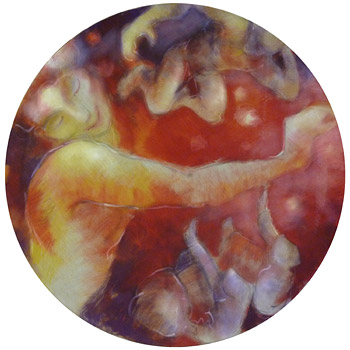 Die in Guérigny in Frankreich geborenen Künstlerin, hat im Laufe der Jahre ihre ganz eigene Technik, einen für sie ganz charakteristischen Stil entwickelt. Es ist die unbehandelte Leinwand, welche den Reiz ihrer Gemälde ausmacht. Hinzukommt, um überhaut einen derartigen Effekt zu erreichen, der individuelle Arbeitsstil welchen Marie-Hélène H-Desrue hierfür anwendet. Die in Mischtechnik mit Tusche und Acryl gestalteten Arbeiten, mit Kohle vor- oder nachgezeichneten linearen Strukturen bringen zum Teil fragmentarische Aktfiguren hervor. Es sind zum Teil undefinierbare Räume, in denen sich diese zu bewegen scheinen, ähnlich einem Raum, in dem die Erdanziehungskraft, sowie Ort und Zeit keine Rolle mehr zu spielen scheinen. Wie mir die Künstlerin erzählte, war es anfangs gar nicht so einfach, runde Leinwände für sich zu bekommen und dennoch hat sie an dem für sie mittlerweile so charakteristischen Format festgehalten. Es sind die weich ineinanderfließenden Farbformen, welche das Moment des Augenblicks zu definieren scheinen.