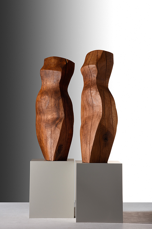 Die Bildhauerin arbeitet ausschließlich mit einheimischen Hölzern. Ihre streng reduzierte Formensprache steht in einem vielschichtigen Dialog mit dem Werkstoff. Von Anbeginn bis hin zu der zarten Oberflächengestaltung arbeitet sie ausschließlich mit der Kettensäge.