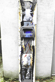 Für jemanden, der zum ersten Mal der Kunst Martin Eckrichs gegenübersteht, kann es ganz schön erschlagend sein. Martin Eckrichs Kunst ist anders, ist neu und außerordentlich vielschichtig. Jetzt bietet er hier in Dahn auch noch das volle Programm. Er zeigt Bilder, Objekte, eine Installation und tritt noch mit seiner Performancegruppe auf, als deren Hauptakteur er selbst agiert. Aber dass er ein umfassendes Repertoire bietet, bietet ja auch eine Chance - ihn besser kennen zu lernen. Und dies ist gut möglich, da bei ihm die unterschiedlichen Kunstsparten alle miteinander verflochten sind. Thematisch gibt es Überschneidungen und auch die Performance bezieht sich unmittelbar auf die Installation.