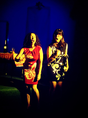 Inmitten der gerade laufenden Ausstellung "Grundformen" singen die Sopranistin Ruth Eberhard und die Mezzosopranistin Malika Reyad Lieder, Chansons und Duette, begleitet am Klavier von Melania Kluge.