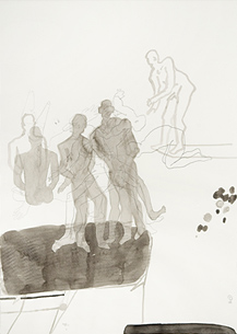 Die Mehrzahl meiner Figuren fliegen, liegen, purzeln anonymisiert über das Papierweiß; anonymisiert heißt: die Figuren sind eigentlich Prototypen, sie stehen stellvertretend für alle möglichen menschlichen Figuren; mit denen kann ich mich theoretisch oder können wir uns theoretisch identifizieren. Aber was passiert mit diesen Figuren? Sie sitzen und liegen (das ist mir zu wenig, das ist mir zu ruhig), sie fliegen, stürzen, purzeln, rennen, kämpfen, umschlingen sich, oft taumeln sie ortlos durch die Gegend, d.h. über das Papier, durch die Welt, durch das Leben. Und wie die Figuren als gezeichnete Zeichen nicht eigentlich greifbar sind, sind auch die Zeichnungen nicht wirklich greifbar, weder für mich, dem Produzenten, noch für Sie, die Betrachter. Das meiste bleibt also vage, sozusagen ein vager Gedanke, der aber im Gegensatz zu den üblichen flüchtigen Gedanken in der Zeichnung bildhaft festgezurrt, materialisiert ist. Damit ist der gezeichnete Gedanke überprüfbar, hinterfragbar. Sie wollen aber keine vagen Gedanken sondern sichere, klare Antworten? Aber, wo gibt es die denn heute, gab es sie jemals?