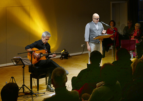 Benno Burkhart. Jazzgitarrist. Presselob auszuschneiden und aufzuheben, kommt ihm nicht in den Sinn. Dass man ihn aber in der Presse immer mal wieder als "virtuosen Saitenzwicker" bezeichnet, ist ihm erinnerlich. Der Komponist und Arrangeur sagt von sich, er praktiziere einen täglichen Triathlon von Gitarre spielen, Rad fahren und Kaffee trinken. Der Musikpädagoge improvisiert eigenwillig auf seinem Instrument und hat ein Händchen für "verrückte" Textvertonungen. Mit Martin Rothe zusammen leitet er den Landauer Kult-Chor "Sing A Pur". Mit Michael Bauer hat er schon in mehreren Lesungskonzerten zusammengewirkt.