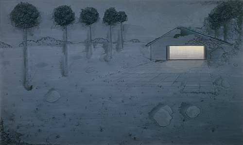 Michael Raedecker: "ins and outs", 2000, Acryl und Faden auf Leinwand, 330 x 198 cm, G. Steinmeijer, Photo credit: Peter Cox