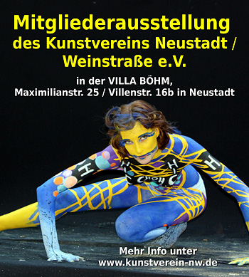 Einen Überblick über die Kreativität in den eigenen Reihen vermittelt der Neustadter Kunstverein alle zwei Jahre mit einer nicht jurierten Mitgliederausstellung. Denn zu den Neustadter Besonderheiten dieses Zusammenschlusses kunstliebender und künstlerisch tätiger Menschen zählt, dass mehr als ein Drittel der circa 280 Mitglieder des Kunstvereins aktive Künstlerinnen und Künstler sind. Das Spektrum der in der Ausstellung vertretenen Arbeiten reicht von abstrakter bis zu gegenständlicher Malerei, von der Fotografie bis zu Skulptur und Installation.