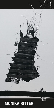 Die Bilder von Monika Ritter sind spontan, schockartig und gestisch in ihrem künstlerischen Ausdruck. Sie sind authentisch, vorwiegend schwarz - die Nichtfarbe -meist auf weißem Grund. Chiffren, ähnlich der Kraft japanischer Schriftzeichen, Spuren unbewusster Malerei - wie Töne im Raum schwebend, sich ausbreitend, aber auch abgebremst, gefesselt, eingewoben, verpackt. Sie sind Ausdruck gegen die rinnende Zeit, präpariert und bandagiert.