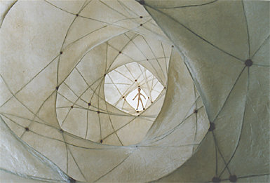 Möglicherweise wundern Sie sich, dass diese Künstlerin sich ausgesprochen dezenter, sparsamer, ja reduzierter Mittel bedient. Dass sie nicht Schaumstoff oder Styropor, sondern gelöteten Draht, Seidenpapier und Knochenleim zum Gestalten verwendet. Nun, mit diesen Materialien hat sie dreizehn Jahre lang gearbeitet - fern allen Dekorierens. Mit ihnen kann sie genau ihre Inhalte präzisieren, beziehungsweise öffnen - ohne Glanz und Glamour. Das mit "5" betitelte Exponat erinnert beispielsweise leise an die Pentagramm-Darstellungen Leonardos. Gestaffelt, teiltransparent, fast sogartig leiten vier der papierenen Konstruktionen den Blick auf ein kleines Gummi-Püppchen - ein Menschlein in nackt-geschlechtsloser Existenz - ohne Rollenverhalten… Es wirkt regelrecht "entblättert", von allen Schichten und Lebensformen befreit. Vielleicht symbolisiert es einen einstigen Ursprung, vielleicht aber auch den umgekehrten Weg - vom Beginn ins so genannte überkomplexe Dasein.