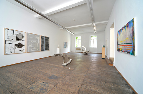 Werner Neuwirth konzentriert sich auf das Mittel der Linie, die unabhängig von gegenständlicher Darstellung das Spiel zwischen Fläche und Raum inszeniert. Gerd Winter lotet die Möglichkeiten in der Fläche aus, in dem er alle Register des Malerischen aktiviert: Farbe, Struktur, Oberfläche gewinnen so ihr Eigenleben im Bild. Matthias Will macht in seinen Skulpturen die Spannung zwischen Schwere und Leichtigkeit, Statik und Bewegung zum Thema. Das die plastischen Elemente verbindende Stahlseil ist für die Konstruktion unerlässlich, gleichzeitig ist es als Zeichnung im Raum zu sehen.