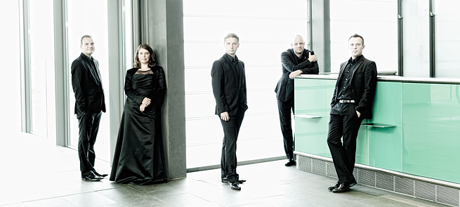 Das Calmus Ensemble mit Anja Lipfert (Sopran), Sebastian Krause (Countertenor), Tobias Plöche (Tenor), Ludwig Böhme (Bariton) und Joe Roesler (Bass).