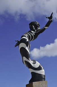 Die Figur "Zeitenspringer" verkörpert genau dieses. Die ursprüngliche Form ist bei ihm kaum noch zu erkennen. Es sind der Kopf und die Schulterpartien der Skulptur "Emotion" - nur, dass jetzt an den Schultern Flügel oder Finnen erwachsen. Die wiederum lösen und verdrehen sich. Das Grundgefühl der Dynamik ist sehr wichtig. Nochmals abstrahiert, in der Mimethik reduziert, entwickelt sich beim "Zeitenspringer" eine eigene Form, die zwar noch amorphe Bezüge hat, aber nur durch Erklärung erkennbar ist. Der "Zeitenspringer" ist eine Sequenz. "Er ist", so der Künstler, "in eine andere Zeit gesprungen. Er ist aus einer Form entwickelt, hat aus sich heraus eine eigene Form kreiert, die, durch den Guss erstarrt, bei sich angekommen ist."