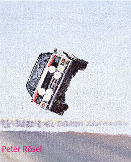 Es sind die Irritationen, die die Arbeiten von Rösel ausmachen, fast immer haben sie reale Aufhänger. So, wenn man auf einem beinahe esoterischen Bild vor den Wallungen des Wüstensands einen Mann mit Helm und Overall vorbeilaufen sieht. Es ist die Momentaufnahme der Begegnung fremder Welten, die auch so stehen bleiben soll. Rösel ist ein Fan von Auto-Rallyes, aber als ihm einmal der rasende Tross in der Wüste tatsächlich begegnet ist, blieb eine Verblüffung übrig, die er in diesem Gemälde konserviert hat. Der Titel des Werks gibt im Übrigen den genauen Standort an, von dem aus es gemalt ist - als so genannter GPS-Code. Allerdings ist der auch nur genau mit dem Handicap, dass dafür die Erde flachgerechnet worden ist.