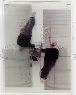 Peter Welz' Interesse gilt der Figur im Raum. In seinen großformatigen Videoskulpturen arbeitet er häufig mit dem Tänzer und Choreographen William Forsythe zusammen. Wie den Tänzer interessieren auch den Bildhauer der Körper und seine Bewegungen. Im bewegten Medium Video können Formen immer wieder aufgelöst werden. Dadurch gelingt es Welz, die Flüchtigkeit des Spannungsverhältnisses zwischen Körper und Raum sichtbar zu machen. Die Ausstellung besteht aus zwei miteinander korrespondierenden Teilen und findet sowohl im Museum als auch - an einem Abend - im Pfalztheater Kaiserslautern statt. Im Museum Pfalzgalerie zeigt Peter Welz eine freistehende Videoskulptur. Zwei Leinwände, die drei mal vier Meter messen, stehen aneinandergelehnt. Auf ihnen erscheint lebensgroß der Tänzer Christopher Roman, Mitglied der Forsythe Company, der sich auf dem Boden liegend gegen dessen Drehbewegung stemmt. Das einfache Bild und die aneinanderlehnenden Leinwände lassen die Figur im Raum so erscheinen, als handele es sich um eine Collage. Eine zerrissene Wirklichkeit entsteht, die auch den Raum des Betrachters zu zerreißen scheint. Die Orientierung im Raum wird fraglich und die Grenze zwischen gesehenem Bildraum und dem Raum des Besuchers verschwimmt.