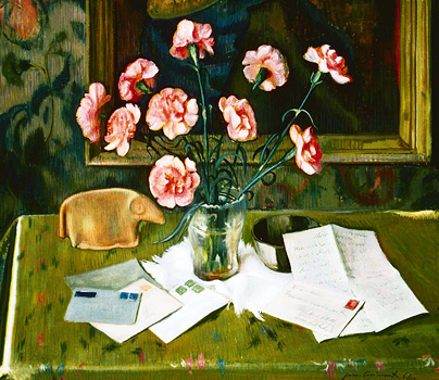 Hermann Croissant: "Stilleben mit Nelken, Post und Figur", 1962