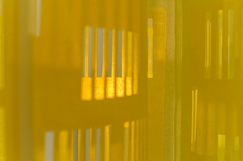Katharina Fischborn aus Langenlonsheim druckt diffizil auf Papier, verwendet dieses Papier dann als Werkstoff für ihre raumgreifenden Installationen. Wie Fenster in Fassaden wirken die Ausschnitte in geschichtetem, monochrom farbig bedruckten Transparentpapier. Die hintereinander geschichteten und ineinander gewirkten Ebenen bilden selbst einen Raum, der aber in seiner Transparenz verwirrt, sich nicht auf eine Abbildung oder einen bestimmten Ort festlegen lässt. Obwohl Fischborn die Komplexität all dessen auf eine sanfte, monochrome Flächigkeit reduziert, wird durch die Schichtung wieder eine neue Vielschichtigkeit erreicht. Sie lässt zu, dass sich die entstehenden Gebilde verselbstständigen, spätestens in dem Moment, in denen sich ein Betrachter in ihnen sehend bewegt.