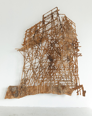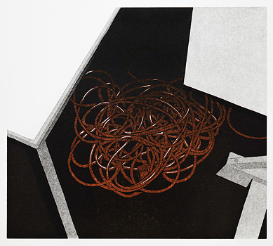 Philipp Hennevogl aus Berlin ist ein klassischer Drucker, sein Spezialgebiet ist der Linolschnitt. Seine Formate und die dargestellten Räume verblüffen in ihrer Wirkung und beeindrucken in ihrer Größe und ihrem Detailreichtum. Er nimmt sich komplizierte Ansichten vor wie Gerüste, vergessene Orte oder auch mit einem Augenzwinkern den Kabelsalat hinter dem Computer oder unter dem Tisch. Das ineinander verwobene räumliche Gefüge wird zum Bild hinter dem Bild, zur ungewöhnlichen Perspektive auf eigentlich gewöhnliche Sujets, zum reizvollen Blick auf die Struktur, im Linolschnitt meisterhaft in Grauwerte zerlegt. Die unglaubliche Präzision der Drucke lässt ahnen, wie konzentriert dieser Künstler arbeitet. Tilmann Zahn aus Binningen (Schweiz) zeigt räumliche Konstellationen, die dem Papier abgerungen sind und in ihrer Farbigkeit die atmosphärische Wirkung der dargestellten Situationen transportieren. Auch er zerlegt in Kontraste und Flächen in filigrane Geäste und Gefüge von Linien, mit einem besonderen Blick für Objekte, die im veränderten Kontext eine merkwürdige, skulpturale Erscheinung bekommen. Die Hängung mit Abstand zur Wand lässt Raum entstehen, Schatten und Geheimnisse hinter den Dingen. In der Nähe zeigen sich zarte Variationen von Brauntönen, die an Rost erinnern und Versehrtheit assoziieren - wie Nachbilder auf der Netzhaut, im Moment des Vorbeifahrens aufgenommen.