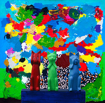 Die Dahner Ausstellung umfasst Bilder von Fischen, Blumen und Menschen sowie einige Plastiken, darunter zwei Türme, bestehend aus 65 Porträtstelen. Im Umgang mit Farbe hat der Künstler durchaus keine Berührungsängste: Die Palette reicht von Acryl- bzw. Ölmalerei, Gouache und Collage bis hin zur bemalten Plastik und Objekt.