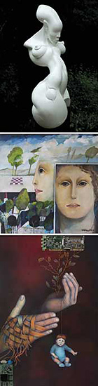 Die farbhellen, poetisch-fantastischen Traumgärten des Dahners Sigmar Kratzin ergänzen die dialogische Präsentation. Die oft symbolhaft verwendeten Elemente für seine verschachtelten Bildräume entnimmt er den klassischen Sujets der Malerei: Landschaft, Stillleben und Portrait. Stilisierte Gesichter dominieren die Kompositionen. Man scheint in die Gedanken- oder Seelenwelt der dargestellten Person blicken zu können.