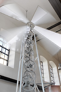 Sind es friedliche Zwecke, denen sich die beiden Konstrukteure verschrieben haben? Steht eine geheimnisvolle Macht hinter ihnen? Wozu dient so ein Unterwassertretfahrzeug? Oder der "Windwandler", dessen "Bediener" zurzeit in der Stadtbibliothek seine weißen Flügel und - immer schön gegenläufig - seine vielen Räder dreht? Klar ist, dass die beiden Erfinder eine Erfindung ihrer Schöpfer sind. Für sie bauen die Schöpfer die Maschinen, in all ihren Teilen aus nutzlos gewordenen, verschrotteten Maschinenelementen und Recycling-Rohstoffen bestehend, wie Felix Redlingshöfer im Gespräch versichert. Im Verzicht auf Verblendungen, Verkleidungen und auf jegliche Farbe sowie im Bestehen auf der reinen Funktionalität aller Bauteile wird so - durch die Reduktion auf das Wesentliche - allerhöchste Ästhetik angestrebt.