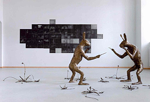 Zwei überdimensionierte, sich einander aufrecht gegenüber stehende Hasen sind in der 2009 entstandenen Installation "Gier und Hunger" mit Messer und Gabel "bewaffnet". Sind sie im Begriff, jeden Moment aufeinander loszugehen oder halten sie während eines Kräfte messenden Kampfes gerade inne?