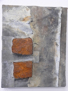 Hier, in den Werkreihen dieses Jahres, hat er Bleistücke von Kirchendächern und alten Häusern verwendet, deren malerischer Oberflächenreiz ihn fasziniert hat. Die Bleistücke sind relativ gut zu verarbeiten, zu glätten, knicken oder falten. Günter Wagner, der von jeher das Wechselspiel der Materialien liebt, hat sie mit Granitsteinen kombiniert, die mit Eisen beschichtet sind. Dessen Korrosionsprozess wurde mittels Laugen und Säuren beschleunigt. Die Bleistücke sind auf Holzrahmen aufgenagelt, ihre Farb- und Oxydationsspuren lesen sich als Zeitspuren. Das ferresierte Steinelement in der Mitte ist eingeklebt, rechts unten findet sich der Signaturstempel.