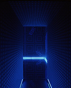 Angekommen im Innenraum, aufgerichtet und nun in schweifendem Blick über Wände, Decke und den auf dem Boden gespiegelten Raum, orientiert sich der Betrachter und sieht die grundlegende Struktur: ein Gitter aus kleinen Quadraten, auf denen oder zwischen denen Zeichen und Kürzel architektonischer Sprache sichtbar werden. Dabei wird der Eindruck von Strenge, der sich aus der vertikalen und horizontalen Zeichenanordnung ergibt, durch diagonale Ordnungen aufgebrochen. Sie lassen in ihrer Dynamik stets eine mögliche Aushebelung des Systems erahnen. Widerstand, Subversivität.