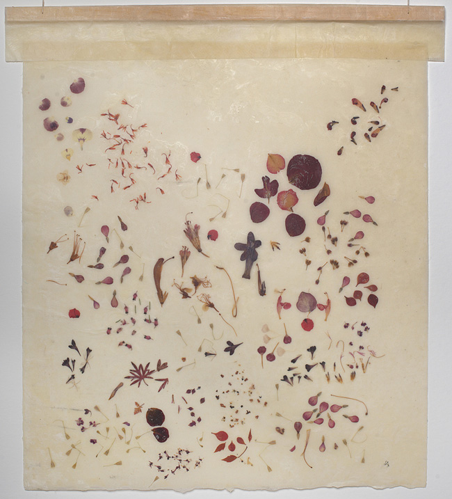 Uta Arnhardt befasst sich mit Pflanzen aller Art. Sie presst Blütenblätter, Blattfragmente, Staubgefäße, Blütenstempel, Samen etc., wobei sie unter Druck geraten. Diese Bildelemente werden zwischen Schichten von Japanpapier kompositorisch angeordnet und mit flüssigem Bienenwachs versiegelt. Mit einem nicht zu heißen Bügeleisen entfernt die Künstlerin das überflüssige Wachs von der fertigen Arbeit, eine zweite Anwendung von Druck. Die Naturfunde bilden das Vokabular einer eigenen Bildsprache.