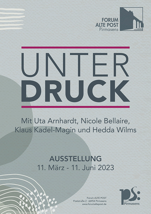 "Unter Druck" lautet der Titel der neuen Wechselausstellung im Forum ALTE POST - und der Name ist Programm: Von März bis 11.06.23 sind im Pirmasenser Kulturzentrum zahlreiche Holz-, Linol-, Sieb- und Direktdruck-Kunstwerke zu bewundern. Allen gemein ist die handwerklich ganz unterschiedliche Gestaltung von Formen und Farben, die aus der Natur genommen, von ihr kopiert oder durch sie inspiriert wurden. Hinter den Arbeiten stehen dabei mit Uta Arnhardt, Nicole Bellaire, Klaus Kadel-Magin und Hedda Wilms vier versierte Kunstschaffende aus der Region.