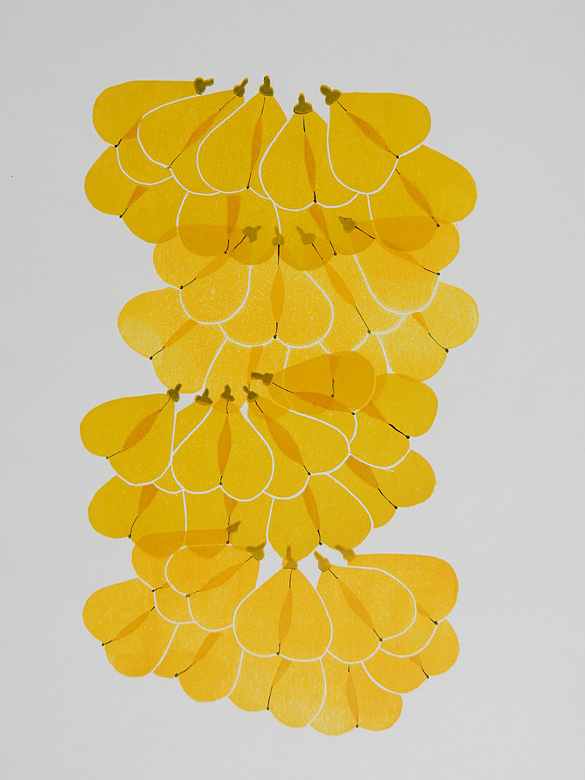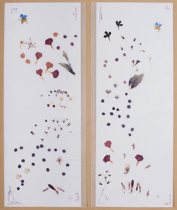 Ich bin eine Sammlerin. Fast immer sind Fundstücke aus der Natur Anfang und Quelle der Inspiration für meine Arbeit. Oft beherrschen zwischen mehreren Papierschichten angeordnete Pflanzenfragmente (Blütenblätter, Samen, Blattfragmente etc.) das Bild. Die aus meiner reichen Sammlung stammenden filigranen Pflanzenteile sind imaginäre Schriftzeichen; die Geschichten, die sie erzählen, entziffert der Betrachter ganz auf seine Weise. Das aufgetragene Bienenwachs lässt die Arbeiten transparent erscheinen, aber die Natur kommt auch indirekt zum Ausdruck, wenn ich die unterschiedlichsten handgeschöpften Papiere als Collagen zusammenfüge. Allerdings verwende ich keine Klebstoffe (coller = kleben), sondern Nadel und Faden befestigen die einzelnen Teile an Ort und Stelle, wobei die Fadenzeichnung natürlich auch eine wichtige gestalterische Funktion hat.