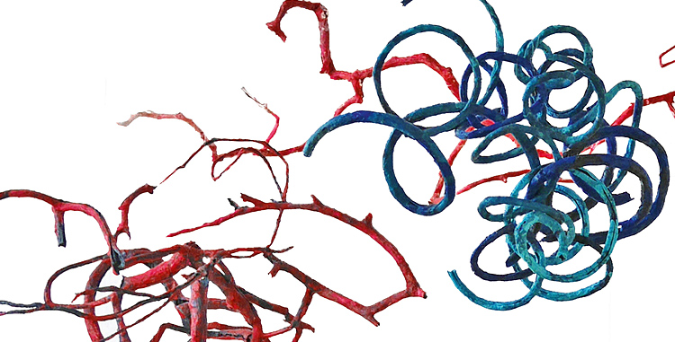 Gefundene Äste werden transformiert: verändert, miteinander verbunden und mit andersartigen, künstlichen Elementen arrangiert. Durch die farbige und formale Bearbeitung verlieren sie ihre ursprüngliche Natürlichkeit und Materialität, sie werden zu etwas Abstraktem, zu Linien und Formen. Die Papierabformungen täuschen durch ihre scheinbare Echtheit vor, dass das Ausgangsobjekt noch real vorhanden und zu erkennen ist. Öffnungen und Risse gewähren aber "Einblicke" und entlarven die scheinbar kompakten Formen als lediglich formumschließende Hüllen, die Fragilität und Hinfälligkeit suggerieren.