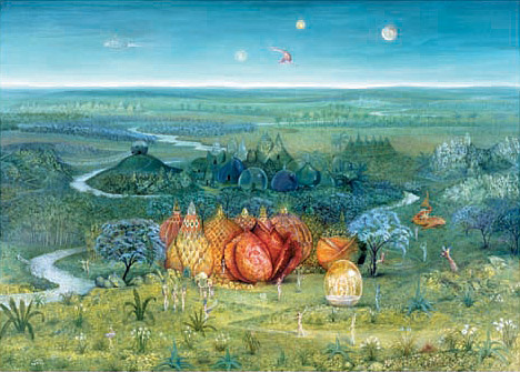 Wolfgang Maria Ohlhäuser erzählt uns in vielen Details wundervolle Geschichten, die er real in Asien und in seinen Träumen erlebt: Landschaften mit Fabeltieren, Gebäude mit Zwiebeltürmen, Traumstädte, exotische Pflanzenwelten und erotische Früchte. Fritz Höraufs Bilderwelt führt uns in tiefe Wälder und durch archaische Landschaften. Gnome, Elfen, Greife und Löwen treten uns entgegen; Götter und Göttinnen werden sichtbar; schweigende Wesen in langen Gewändern verharren vor noch nie gesehenen Tempeln, deren Architektur sich oft aus einer vegetativen Gotik entwickelt.